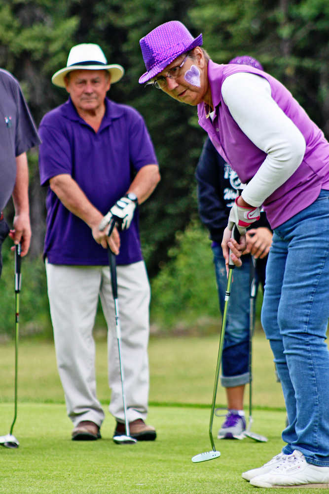 Buttons Bush putts her golf-ball into a hole at the Alzheimer's Association's Longest Day golf tournament fundraiser on Saturday, June 18 at the Bird Homestead golf course in Funny River. Her teammates looking on are Keith Stewart (left), husband Bob Bush, and daughter Karen Burger. Bush's team - one of the nine competing - wore purple, the Alzheimer's Association's awareness color. Burger, an organizer, said that the tournament had raised $1,900 for Alzheimer's disease research before its conclusion Saturday night.