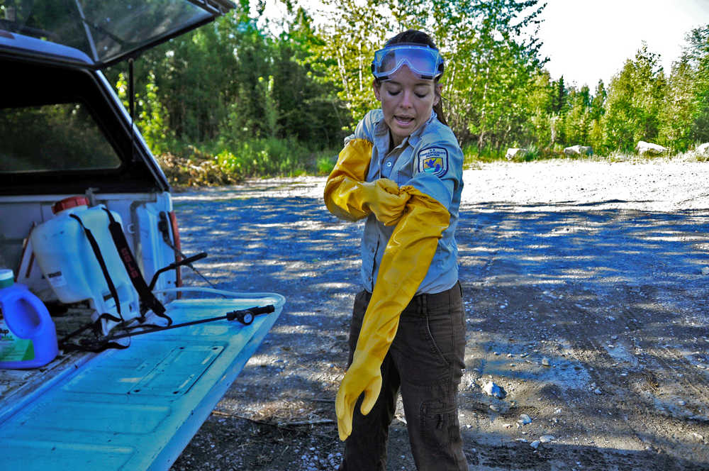 Wearing a pump-powered backpack sprayer, long yellow gloves and protective goggles, Jen Peura looked more like she was out hunting ghosts than killing flowers.