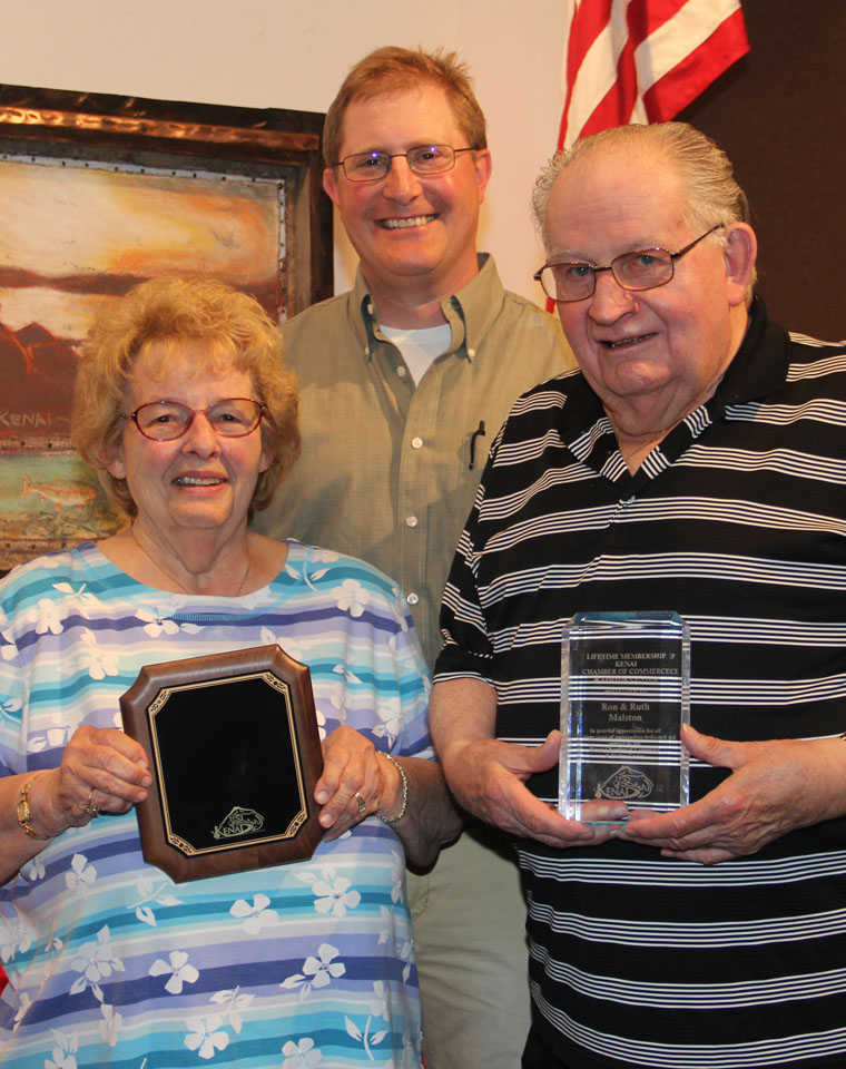 The 42nd Annual Kenai Community Awards luncheon was held June 15th at the Kenai Chamber of Commerce and Visitors Center (KCCVC). Board President Bruce Jackman started by recognizing Ron and Ruth Malston with a Lifetime Chamber membership for all their years of business in the Kenai community and their involvement with the Kenai Chamber of Commerce. The Malston’s later were additionally honored with the Pioneer Award presented to persons who have been in the Kenai area for at least 25 years and who have been instrumental in the development of business in the community. The Malston’s have been doing business in Kenai for 45 years, “We had to present them with a blank plaque in order to surprise them because the Malston’s are the ones who do our engraving,” laughed Johna Beech, Chamber COO. The esteemed Log Cabin Award this year went to Hal & Susan Smalley and states that there is, “An unwritten law in Alaska that a cabin in the wilderness is refuge to all weary travelers. A moral obligation requires those using a cabin to replenish the wood and supplies, thus leaving the cabin ready for the next traveler. The symbol of the law and award is to recognize those have contributed to the community and leave it a better place because they were here.”