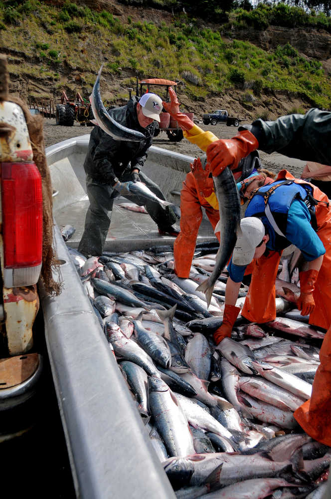 Heidi Chay, who fishes on the Barnes site, drove a truck full of fish north along the beach toward the Alaska Salmon Purchasers buying station, passing the Nyce site on the way, where fishermen playfully pitched fish over one another’s shoulders, dodging the flying slime.