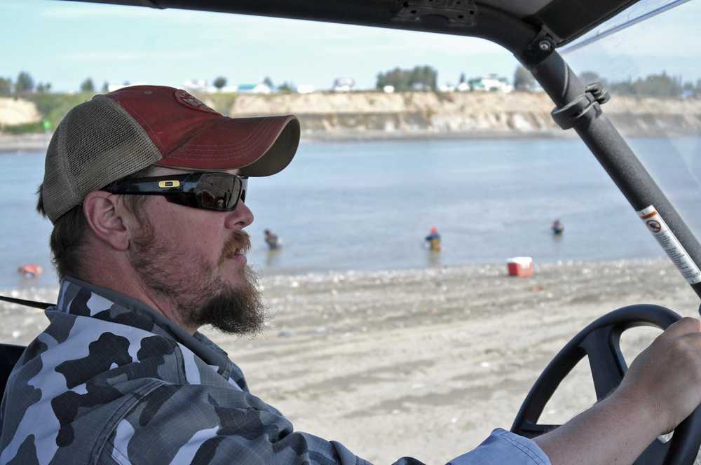 Photo by Elizabeth Earl/Peninsula Clarion Jason Floyd, the owner of Ammo Can Coffee, drives a side-by-side on the south beach of the Kenai River on Monday, July 18, 2016 in Kenai, Alaska. Floyd parked a trailer serving coffee near the entrance to the personal use dipnet fishery and makes delivery runs along the beach, selling ice and taking coffee orders.