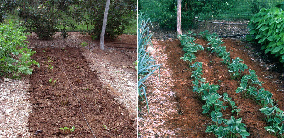 This undated combination photo taken in New Paltz, N.Y., shows a strawberry bed, left, after being renovated, and at right a few weeks later, readying for next spring's crop. (Lee Reich via AP)
