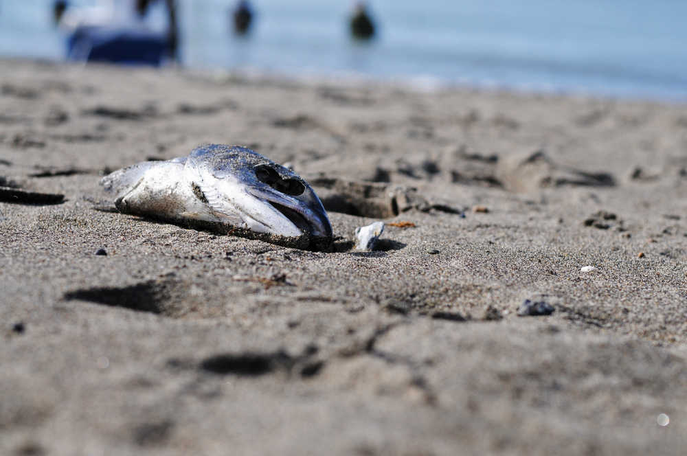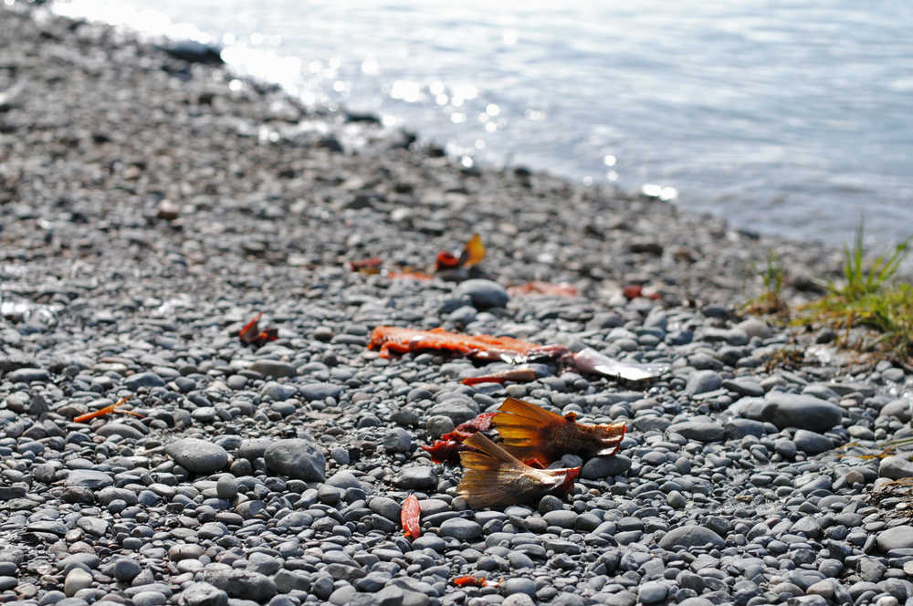 At any given point, there are several lines drawn across the Kenai beach — the drag poles of dipnets, footprints on their way to the water and the cast-off heads and carcasses of dead fish.