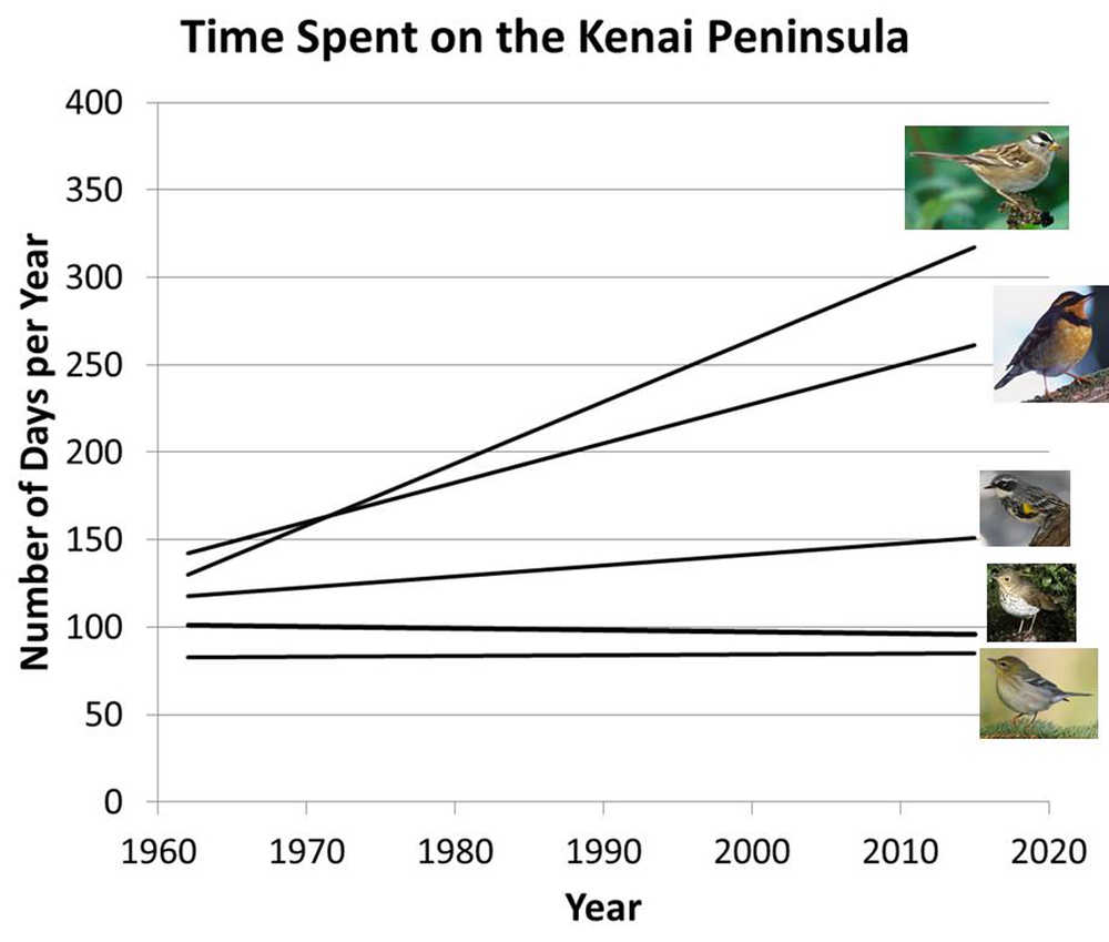 In contrast, other species have shifted to spend more time here. White-crowned Sparrows seem to overwinter now, extending the time this species are observed here by 200 days! Varied Thrush are spending on average 145 more days on the Kenai Peninsula and over-wintered in Seward and Homer in 2013 and 2014. A paper published in 1965 in the “The Condor” reported that a few White-crowned Sparrows were seen at feeders in Anchorage in the 1960s, but not on the Kenai Peninsula. Varied Thrush were not documented anywhere in Alaska during winters at that time.