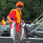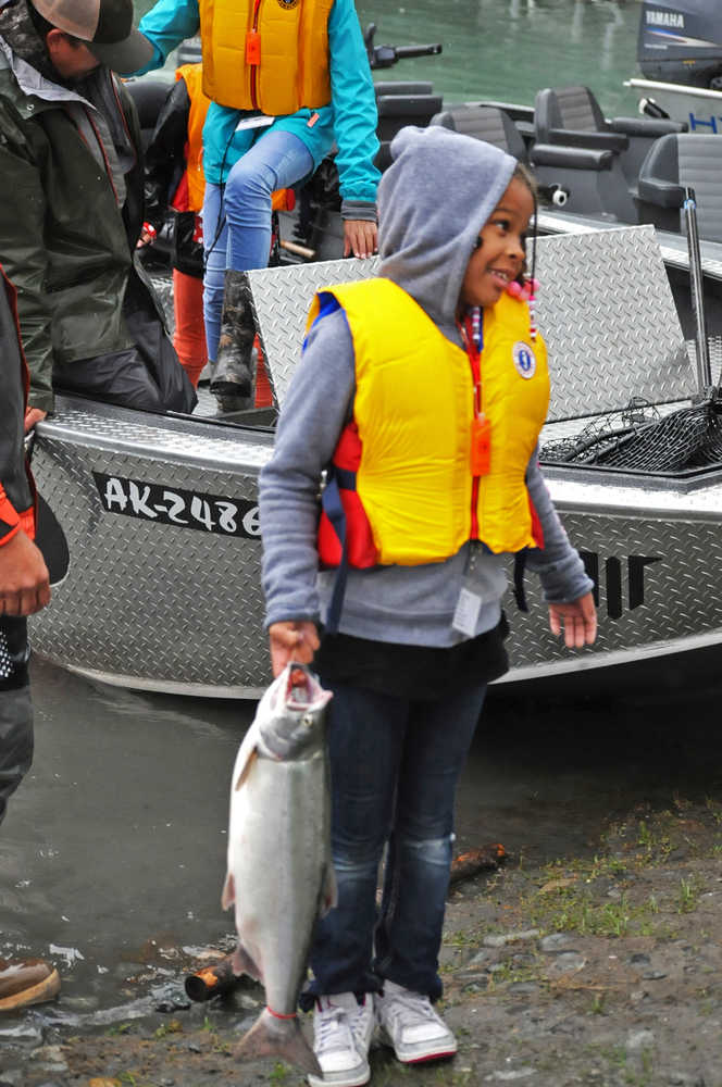 Groups of young anglers crowded the boat launch Thursday, Aug. 11, 2016 at Centennial Campground in Soldotna, Alaska during the annual “Take Our Kids Fishing” event hosted by the Boys & Girls Club and the Kenai River Foundation. Licensed guides volunteer their time to take kids out for free to fish the Kenai River in the afternoon, and on Thursday, many had luck with pink salmon and silver salmon. Kids from the local Boys & Girls Club chapter and from the chapter in Anchorage attended, but the event is open to the public every year for all kids to participate.
