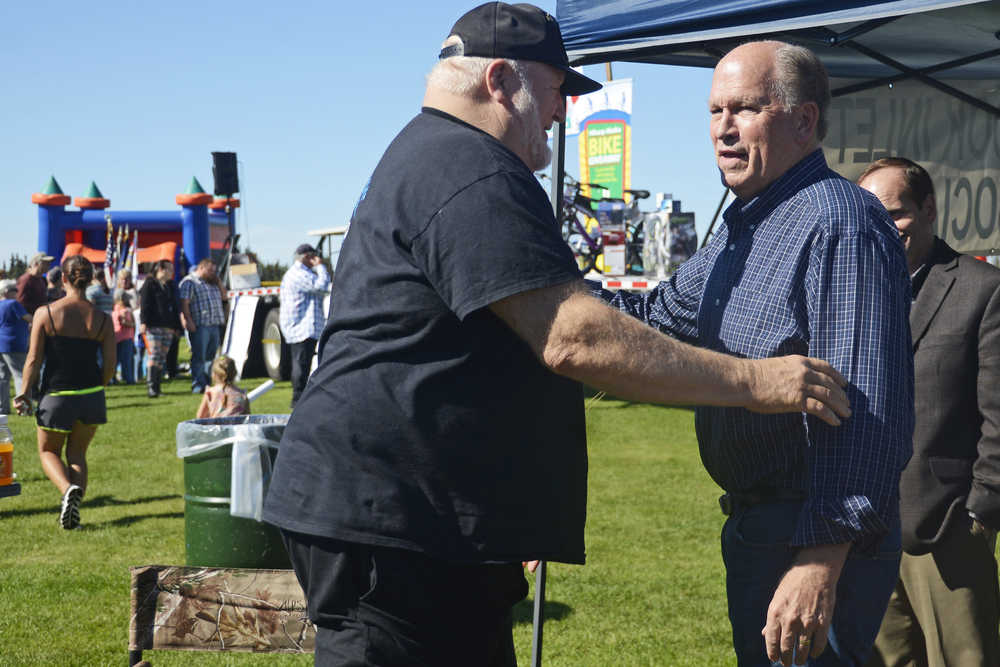 Photo by Megan Pacer/Peninsula Clarion Gov. Bill Walker greets Kenai resident Ron Rust during a trip to Industry Appreciation Day on Saturday, Aug. 27, 2016 in Kenai, Alaska. Walker is making stops all over the state to speak with representatives of local government about the state's fiscal situation.