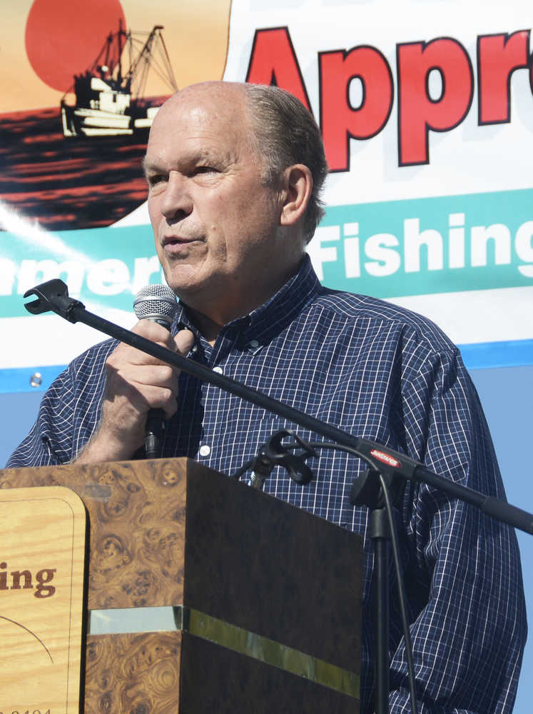 Photo by Megan Pacer/Peninsula Clarion Gov. Bill Walker speaks to a crowd of area residents during Industry Appreciation Day on Saturday, Aug. 28, 2016 in Kenai, Alaska. Walker is making stops across the state to speak to members of local government about the state's fiscal situation.