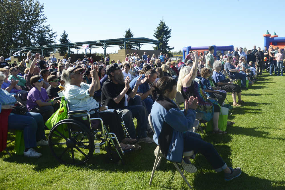 Photo by Megan Pacer/Peninsula Clarion Attendees of Industry Appreciation Day applaud Gov. Bill Walker during his visit Saturday, Aug. 27,2016 in Kenai, Alaska. Walker is making stops across the state to speak about Alaska's fiscal situation.