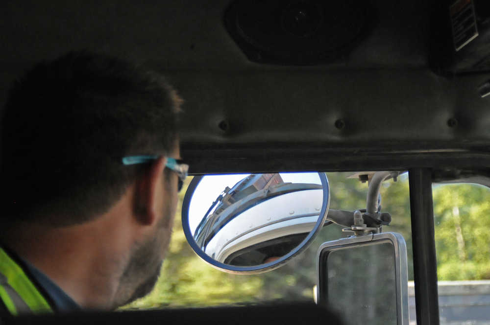 Each day, he drives prescribed routes to homes and businesses, looping from homes deep in the Nikiski woods to oil and gas businesses where he has to punch in passcodes to enter the gate. Ticking off each stop as he goes, he knows businesses by their trash habits. In July, he would pull expertly up to a garbage bin in Old Town Kenai, emptying its contents into the back of the truck by mechanical arms in less than a minute as dipnetters messily cleaned fish on a table nearby. He nodded as he emptied one garbage bin not marked for fish garbage.