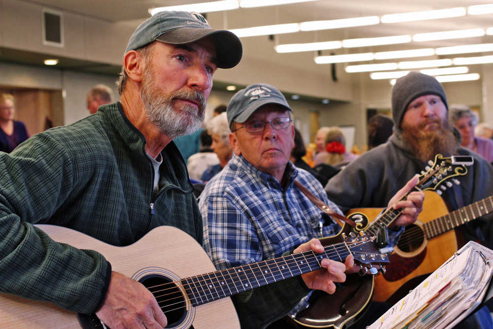 Ben Boettger/Peninsula Clarion Guitarist Myke Ables (left), mandolinist Rick Epling, and guitarist Nathan Epling look toward the song leader of their bluegrass jam at the Kenai Fall Fest, Thursday Sept. 22 at the Kenai Senior Center. In addition to being part of the festival, the event was one of the Senior Center's weekly Thursday night jam sessions. A microphone stand on wheels rolled around the circle of about 10 musicians, who took turns calling a tune and a key. "Musically, this is all about having fun," Rick Epling said. "If it goes much beyond that, it sort of defeats the point."