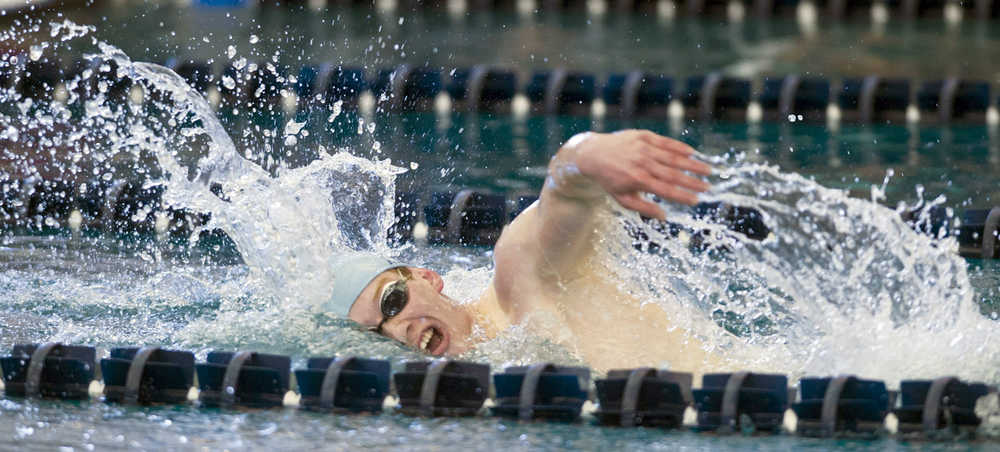 Photo by Michael Penn/Juneau Empire Soldotna's Jacob Hall swims to a second place in the boys 500-yard freestyle race during the 2016 ASAA/First National Bank Alaska Swim & Dive State Championships at the Dimond Park Aquatics Center in Juneau on Saturday, Nov. 5, 2016.