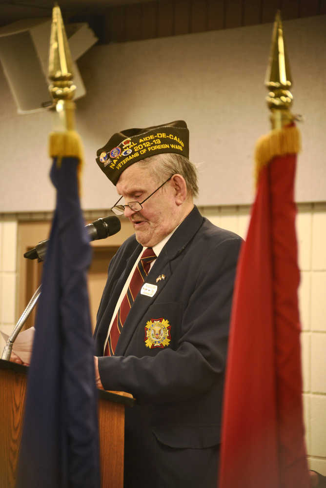 Summarizing his own story, Halliday— an Alaska Army National Guard State Dental Surgeon — jokingly described himself as “a dental school drop-out,” due to the fact that he left his classes for a year to be deployed in Operation Desert Storm. He’s since provided dental services in Bosnia and Afghanistan, as well as missions in Mongolia and humanitarian work in Surinam. Others at Friday’s ceremony at the Soldotna Regional Sports Complex also brought with them wide-ranging experience — from Bill Field, wounded by grenade shrapnel in the World War II Battle of Okinawa, to Greg Fite, a member of the first Alaskan unit to be deployed to Iraq, and National Guard Officer Marty Hall, who served in Alaska during the late Cold War era.