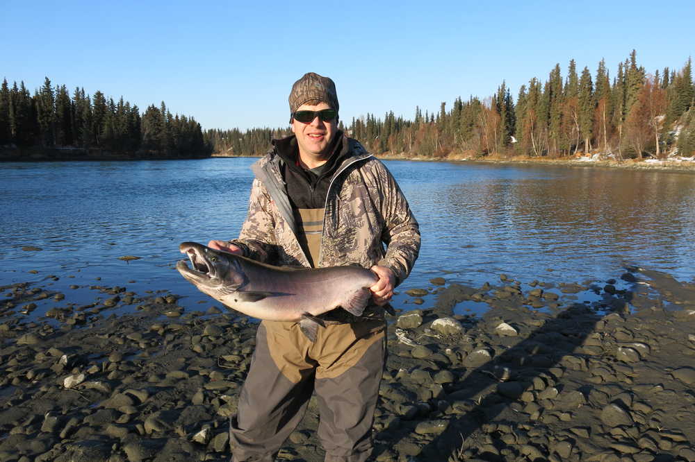 It is also a scene I have been lucky enough to replay on several occasions on my home river, the Kenai. As the water drops each fall, at times the silvers will gather in the shallows and you can actually get out of the boat and stalk them, a lot like bonefishing on the flats of the Bahamas, except, of course, you are bundled up in waders rather than wearing shorts.