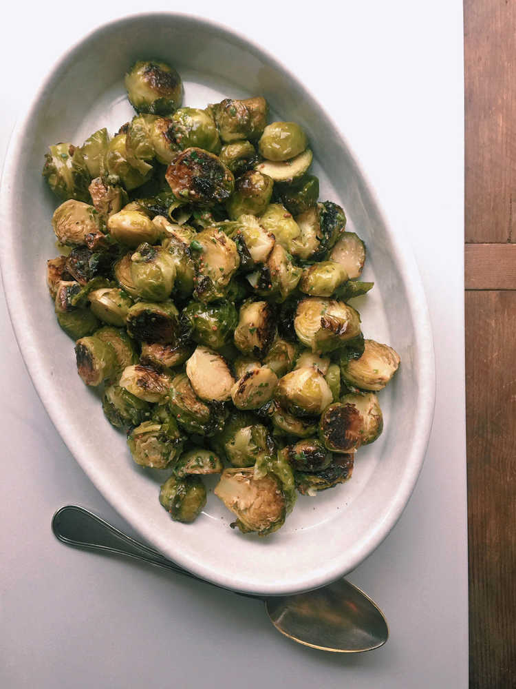 This October 2016 photo shows a warm Brussels sprouts salad with anchovy vinaigrette in New York. This dish is from a recipe by Katie Workman. (Katie Workman via AP)