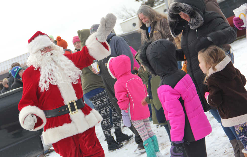 Hundreds of folks turned out on the day after Thanksgiving to kick off Christmas Comes to Kenai in a traditional celebration that goes back to when the Kenai Chamber started with Peggy Arness as its first director. Santa Claus himself has had a standing engagement on the day after Thanksgiving with the Kenai Chamber and the Kenai Fire Department and while his legendary reindeer are resting up for their global tour Christmas Eve, the Jolly Ol’ Elf arrives atop the KFD Firetruck. “He was at the Visitor Center until about 3:00pm posing for photos with hundreds of kids that were sitting on his knee for the first time. Jen Dye was our photographer this year and each family went home with a free photo and goodie bag compliments of Santa and the Kenai Chamber,” said Johna Beech, Kenai Chamber CEO. Then just a few hours later, after a cookie and milk break, Santa returned atop the KFD Firetruck to greet hundreds of enthusiastic jumping up and down boys and girls who turned out on a chilly evening for the Chambers Electric Light Parade, bonfire and fireworks display. “We were afraid we’d have another warm snowless Christmas Comes to Kenai this year, but Mother Nature heard our cry and gave us a winter wonderland. We had a great turn out for the parade with twelve float entries this year. For the first year Fred Myer and Lynden Transport partnered and came up with an amazing float that won first place this year,” said Beech. Other parade winners were the Kenai Peninsula Racing Lions for the best organization entry and once again the terrific KCHS Drumline were the judge’s favorite for the best youth entry. “We like to remind shoppers that events like Christmas Comes to Kenai is funded by local businesses who reinvest in fun for the local community. Sponsors like Doyle’s Fuel Service and Weaver Brothers along with the City of Kenai who sponsored our fireworks display, Udelhoven Oilfield Services sponsored the gifts for the kids visiting Santa and dozens of other sponsors that take the dollars you spend with them and reinvest them in our community to improve our quality of life,” said Beech.