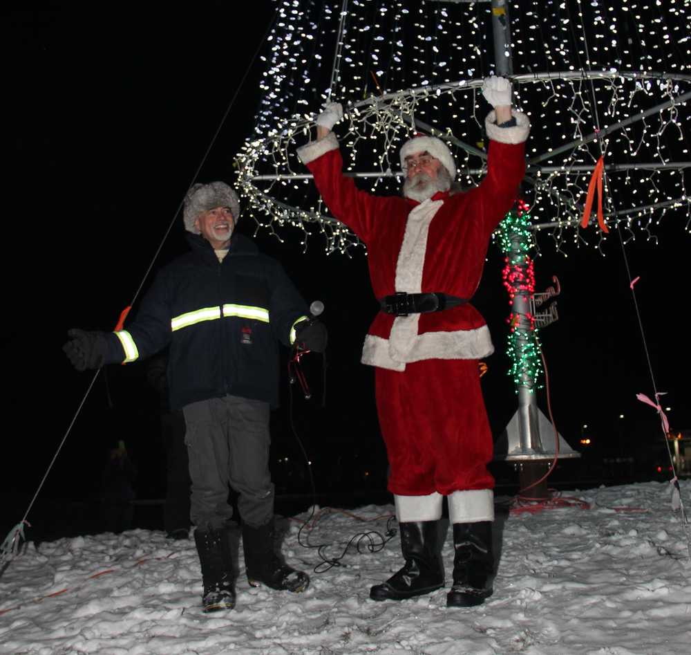 Children eagerly followed the pied piper of Christmas to the giant aluminum tree in the park where the Jolly Ol’ Elf raised his hands and counted down from ten and when he reached one the tree magically sprung to life illuminating thousands of led lights on the tree created for Soldotna by ConocoPhillips.