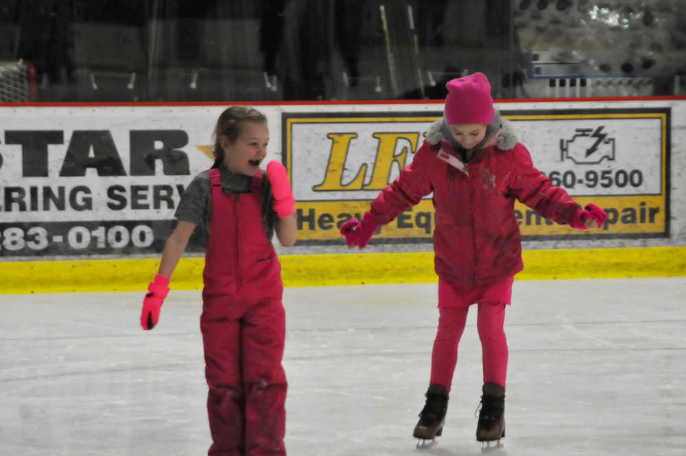 Photo by Elizabeth Earl/Peninsula Clarion Jesse Evarts (left) and Serenity Plate (right) skate together on the Soldotna Regional Sports Complex's ice rink during a class skating event Monday, Dec. 19, 2016 in Soldotna, Alaska. The students, some slipping and some gliding, skated around the rink for several hours Monday.