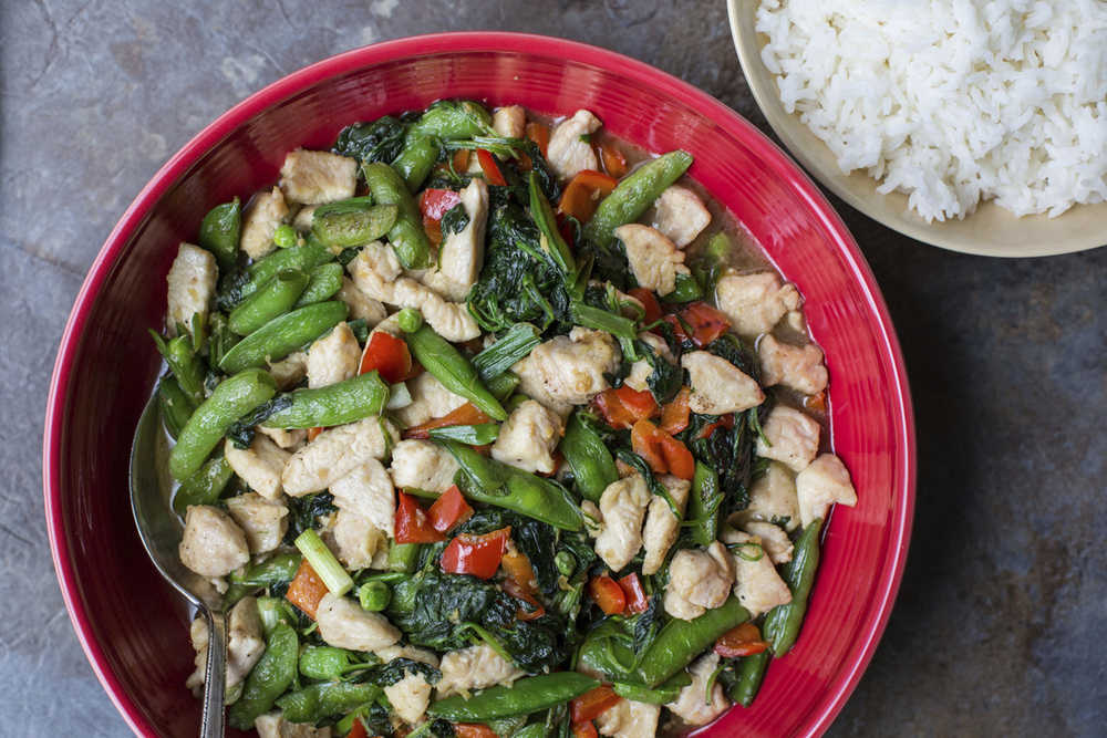 Return the pan to medium high heat. Add the remaining tablespoon oil, then add the sugar snap peas and peppers and sauté for 1 minute. Then add the spinach by the handful and stir-fry until it wilts, adding more as the volume goes down, until all of the spinach is added and somewhat wilted. Add the chicken broth and bring to a simmer. Add the oyster sauce mixture, and return the partially cooked chicken to the pan. Simmer, stirring occasionally for another 2 minutes, until the chicken is cooked through. Serve over the hot rice or quinoa.