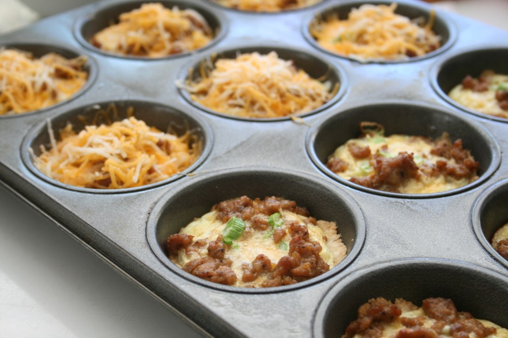 In a small mixing bowl, whisk together egg with milk. Stir in scallion, mixing to combine. Spoon about 1 tablespoon of the egg mixture into each muffin well. Bake for 20 minutes or until lightly browned and slightly puffed. Remove from oven and divide cheese over each biscuit. Return to oven and bake for an additional 5 minutes or until cheese is melted. Remove tin from oven and allow biscuits to rest for a few minutes before popping them out of the tin. Serve immediately. Makes 12 biscuits. *Kitchen Ade note: One (1/2-pound) package bulk breakfast sausage, cooked, drained and crumbled, may be substituted for the pre-made sausage crumbles.