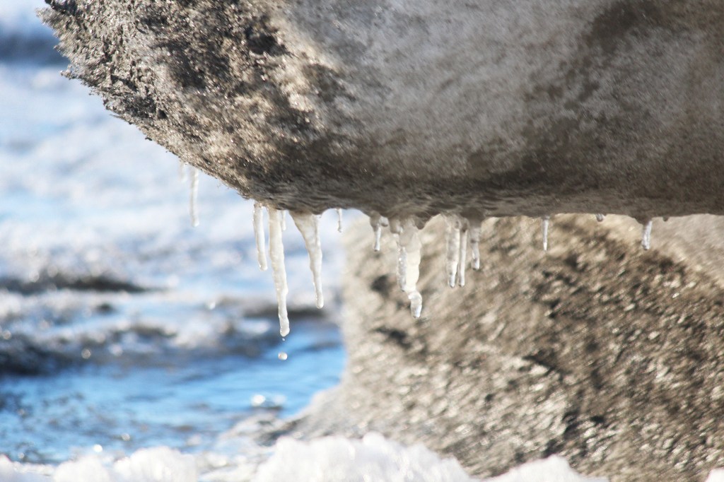 Water drips from a boulder of ice and sand on the beach at the mouth of the Kenai River on Wednesday, Feb. 15, 2017 in Kenai, Alaska. Kenai has been in a warm spell this week, with a high near 36 degrees on Wednesday afternoon. Warm weather is expected to continue, with highs in the 30s through Friday, according to the National Weather Service. (Megan Pacer/Peninsula Clarion)