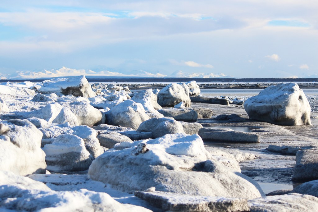 Chunks of frozen ice and sand line the beach at the mouth of the Kenai River on Wednesday, Feb. 15, 2017 in Kenai, Alaska. Kenai has been in a warm spell this week, with a high near 36 degrees on Wednesday afternoon. Warm weather is expected to continue, with highs in the 30s through Friday, according to the National Weather Service. (Megan Pacer/Peninsula Clarion)