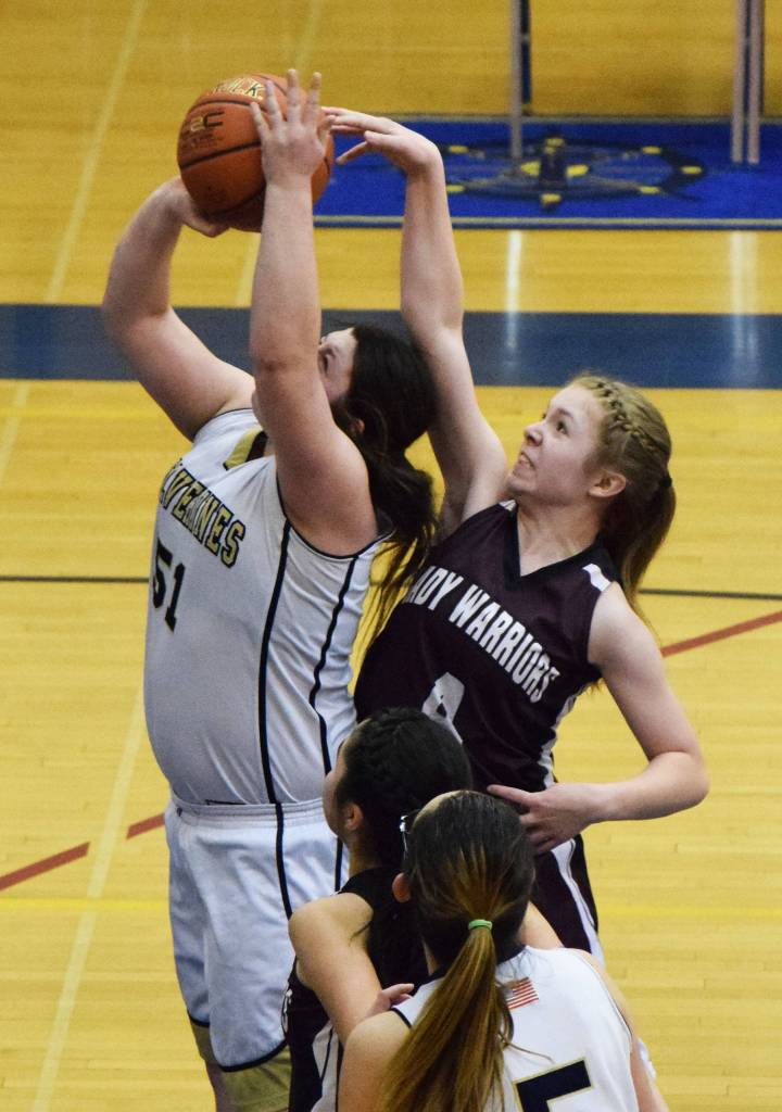 Ninilchik’s DeeAnn White (left) looks for space against Nikolaevsk’s Elizabeth Fefelov in the second half of Friday’s Peninsula Conference girls championship game at Homer High School. (Photo by Joey Klecka/Peninsula Clarion)