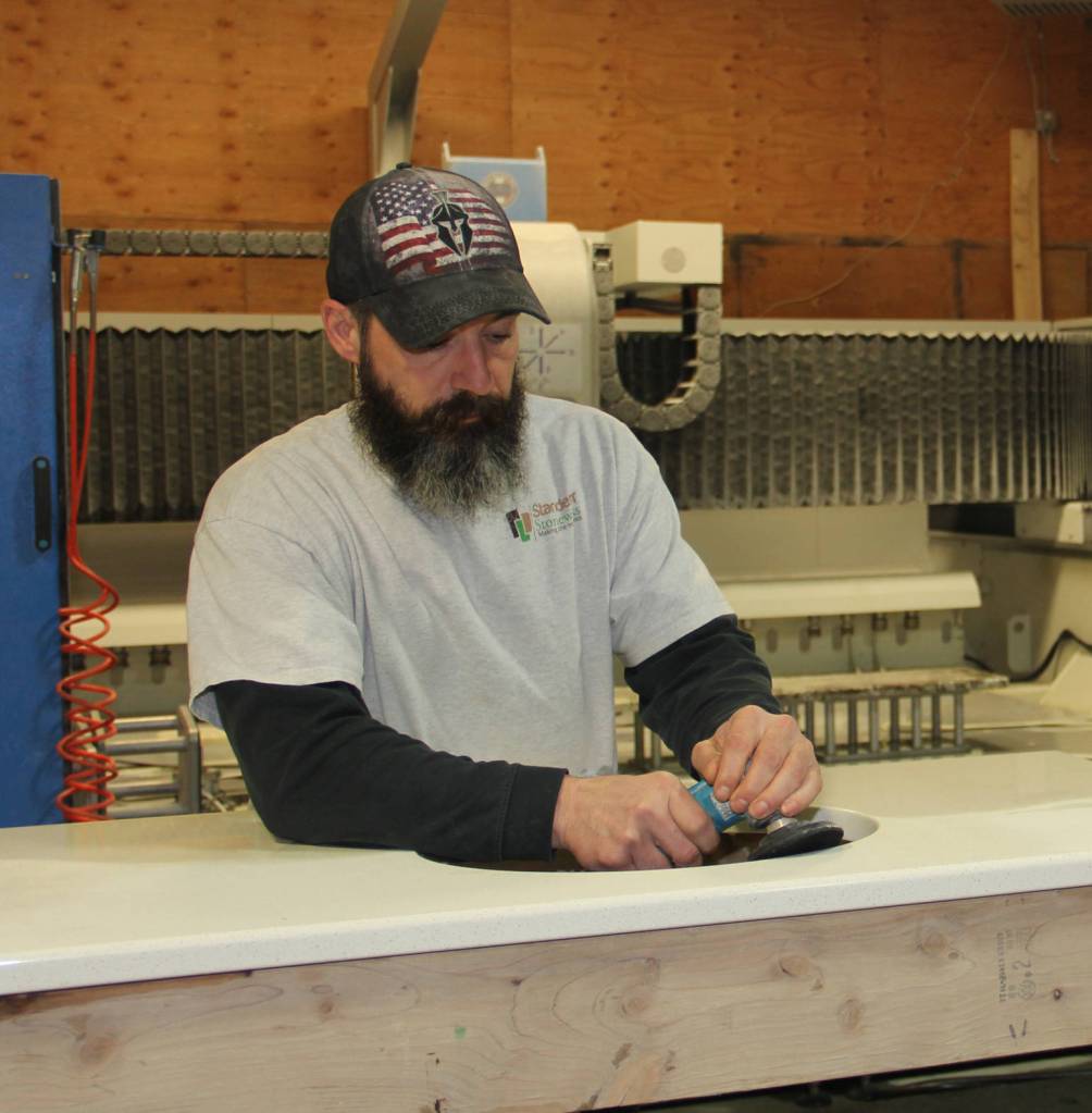 Foreman Nick polishes an undermount sink cut out on a quartz vanity at Standerfer Stoneworks.
