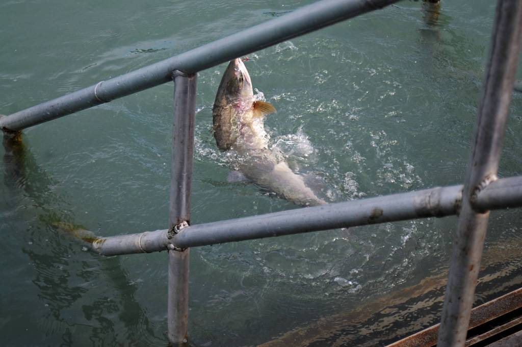 In this August 2016 photo, an angler lands a pink salmon on the docks at Centennial Park in Soldotna, Alaska. (Elizabeth Earl/Peninsula Clarion, file)