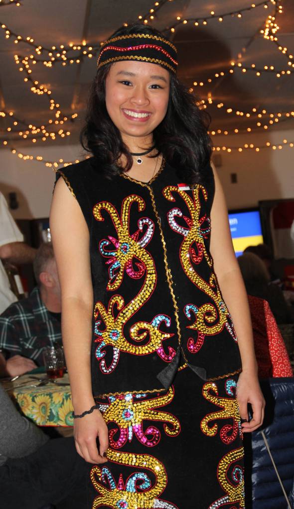 “I’m wearing the traditional clothes the biggest island in Indonesia called Borneo. Being in a country that is very different from your own with no one you know to rely on I believe bonds exchange students in a special kind of friendship and we rely on each other because we know how each other are feeling being away from home. We share the experience of learning to be comfortable being uncomfortable. I’ve learned not to be afraid to look stupid because you will live through it no matter what you do once you’re comfortable with it you know you can learn anything. An event like tonight that brings us all together is wonderful and we learn to embrace all cultures,” said Afina.