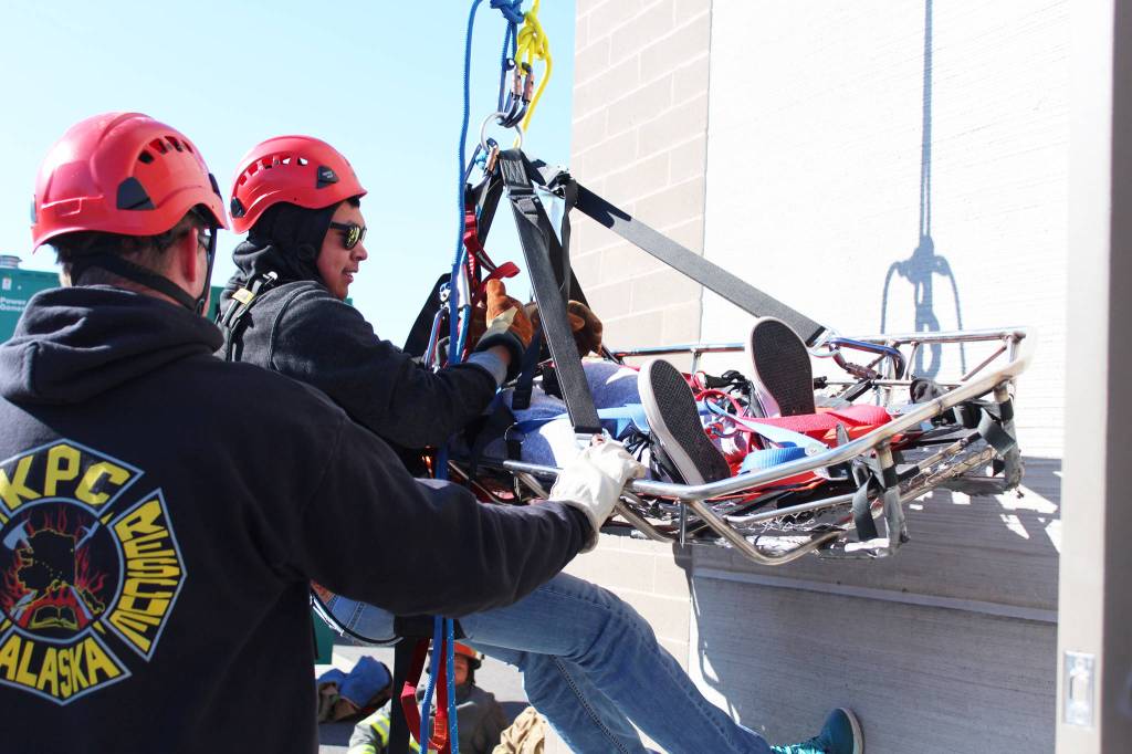 On Wednesday afternoon, 18-year-old Simon Andrews, who attends Mountain Village School, rappelled down the side of the tower at Nikiski’s Fire Station No. 2 with 17-year-old Alakanuk School student Leona Wasky in tow, practicing a rescue skill. With Wasky strapped onto a board, Andrews climbed up the side of the wall and rapelled back down with her, with the help of the other students.