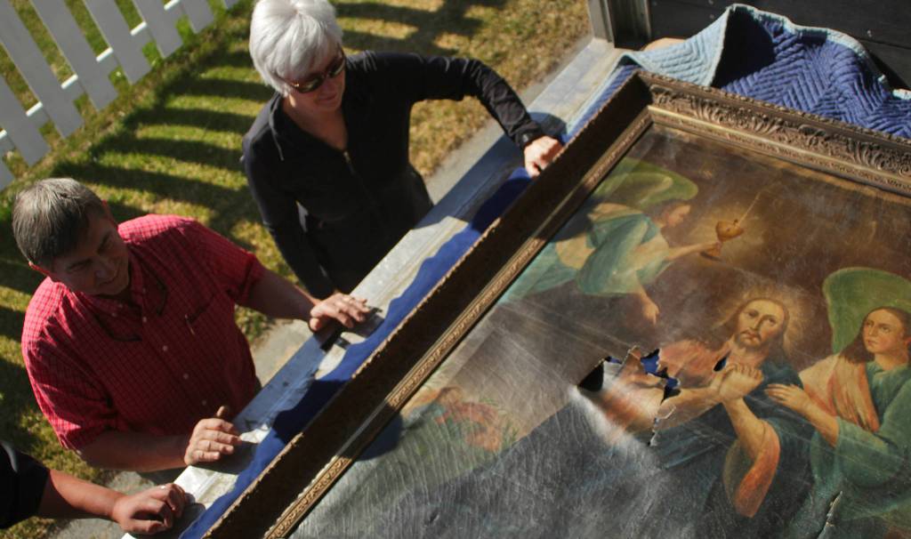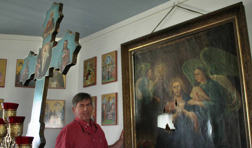 John Michael, a member of Kenai’s Holy Assumption of the Virgin Mary Russian Orthodox Church, prepares to carry a damaged icon of Jesus praying in the Garden of Gethsemane from the church’s sanctuary on Monday, May 15 in Kenai. In the foreground stands the wooden cross that fell backward during the January 2016 Iniskin Earthquake, tearing the icon’s canvas. After planning and fundraising for the icon’s repair since mid-2016, the church shipped it to an art restorer on Monday.