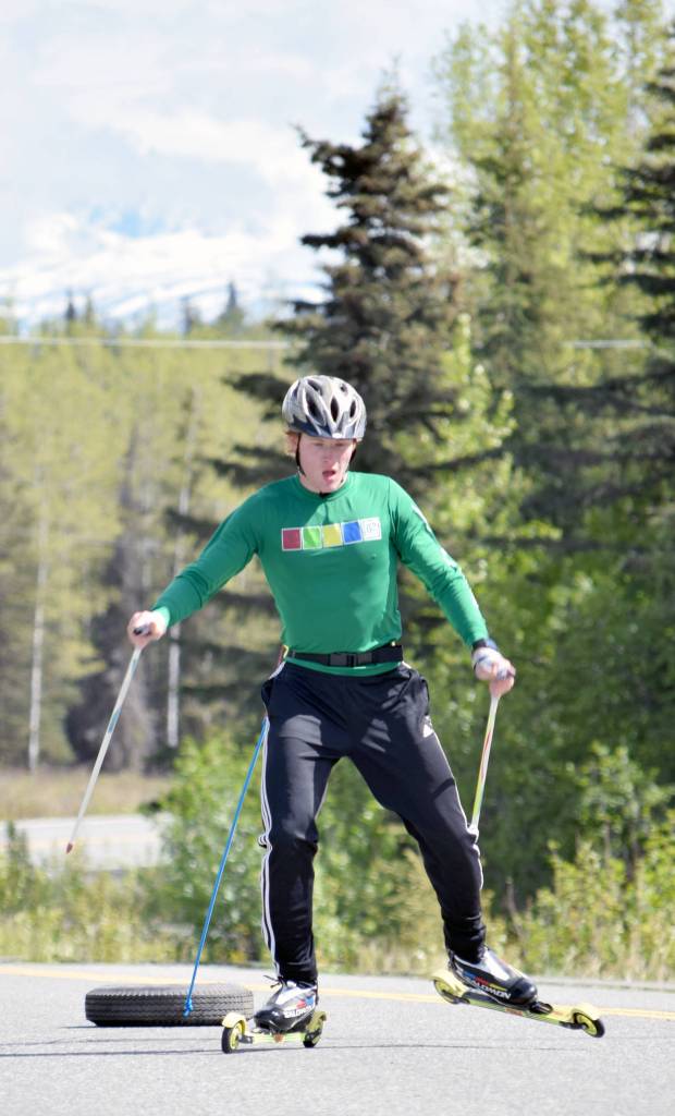 That’s why motorists on South Coho Loop on Monday were looking out their windows and seeing participants in the Andy Liebner Cross-Country Ski Camp pull tires or half tires up a hill while roller-skiing.