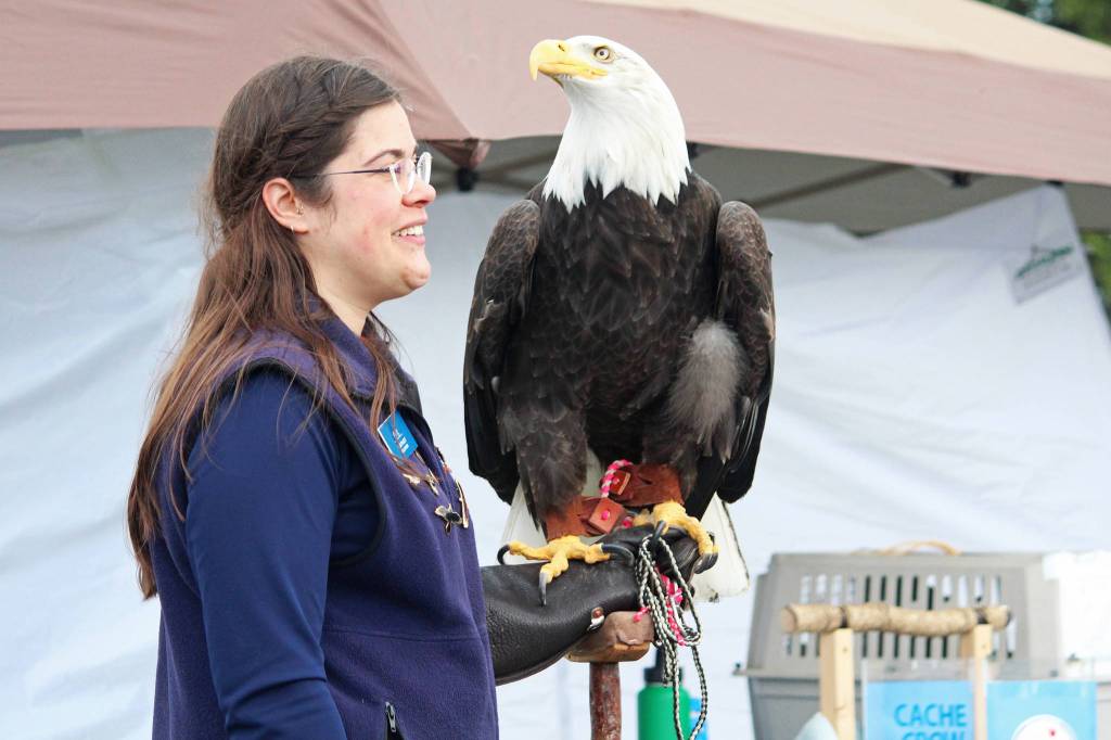Lisa Pajot of the Bird Treatment and Learning Center speaks to gathered onlookers about Petra, a 23-year-old eagle, while Petra surveys the scene at this year’s Kenai River Festival on Saturday, June 10, 2017 at Soldotna Creek Park in Soldotna, Alaska. (Megan Pacer/Peninsula Clarion)