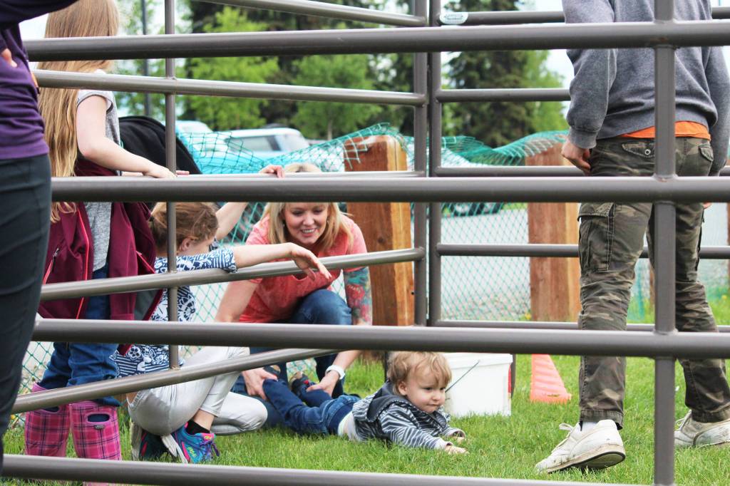 Chere Abigo of Soldotna pulls Blake Abigo, who is almost 2, out of a goat pen after he got curious and wanted to take a closer look at the annual Kenai River Festival on Saturday, June 10, 2017 at Soldotna Creek Park in Soldotna, Alaska. (Megan Pacer/Peninsula Clarion)