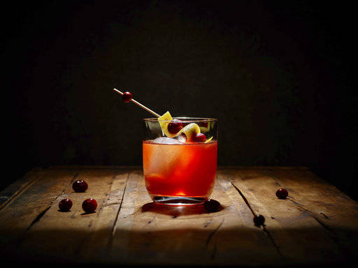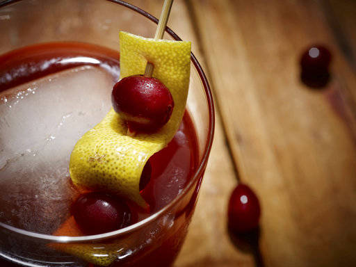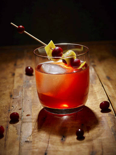 Strain into a rocks glass over large ice cubes and top with the sparkling cider. Garnish with cranberries and orange peel.