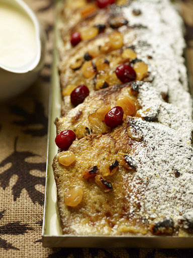 Transfer to a serving platter as done, dust with confectioners’ sugar, and garnish with dried fruit. Serve right away with crème anglaise.