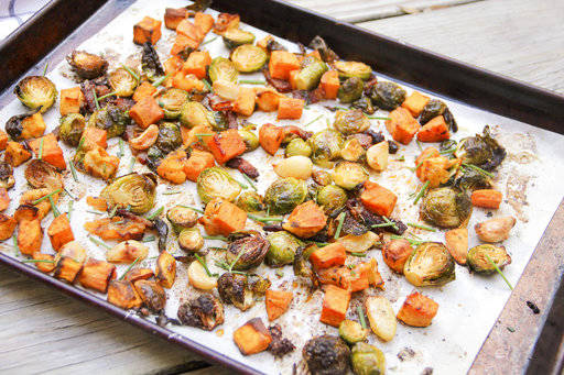 Brussels sprouts and their ever-popular companion bacon are teamed up with sweet potato to make a tasty oven-roasted hash that requires just minutes of prep time to cube the veggies, all of which can be done a day in advance.