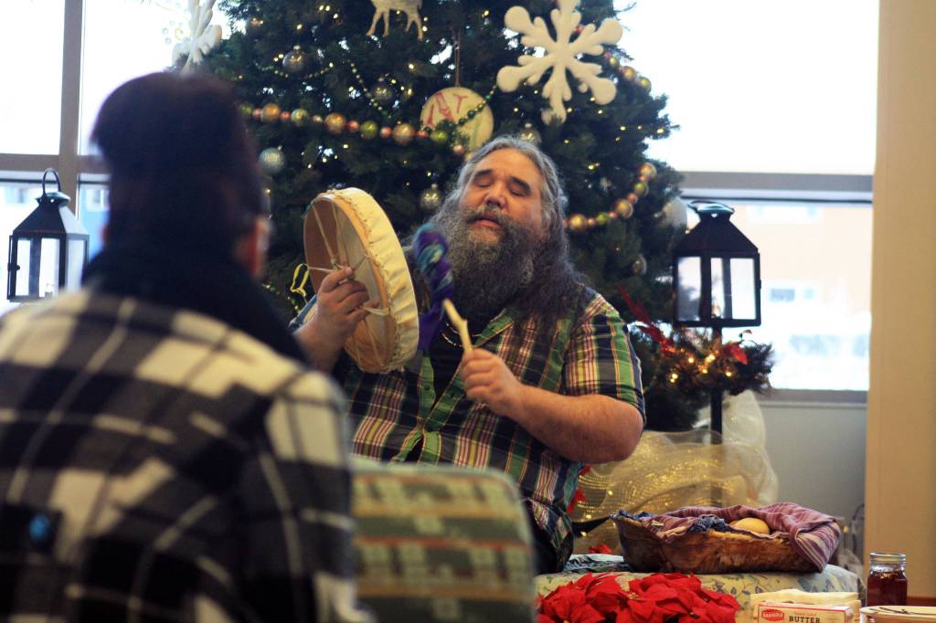 On the darkest day of winter, with a barely risen sun setting behind him, local musician George Demientieff Holly brought a little light to the lobby of the Dena’ina Wellness Center in Old Town Kenai.