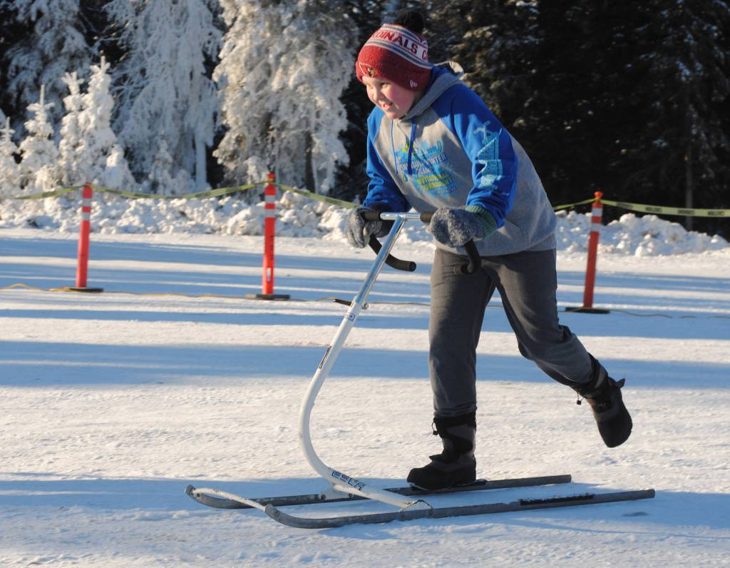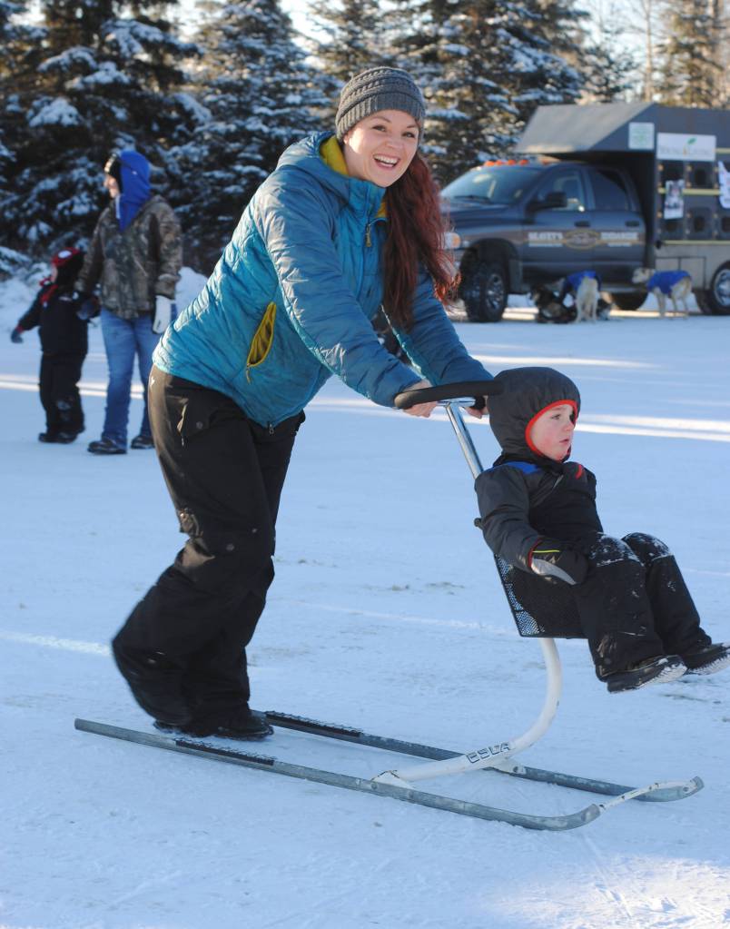 Donna Edmunds, of Soldotna, pushes her son Lucas on a ski buggy during the annual Peninsula Winter Games, which returned to Soldotna for the forty second year on Saturday at the Soldotna Regional Sports Complex. The event offered an array of children’s events and activities, including a Monopoly tournament, an outdoor film, free lunch and a carnival. The Kenai Peninsula Hockey Association also held an invitational hockey tournament during the event. (Photo by Kat Sorensen/Peninsula Clarion)