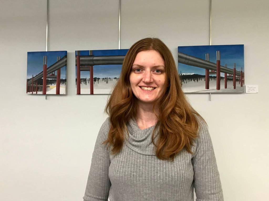 The art on display, acrylic paintings, are a diverse bunch. A triptych titled ‘Piping Hot’ graces the far wall and shows the Trans-Alaska Pipeline System.