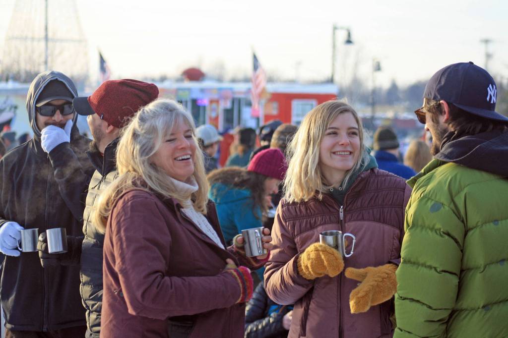 Brewers pour craft beers for attendees at the 4th annual Frozen RiverFest at Soldotna Creek Park on Saturday, Feb. 17. Sponsored by the Soldotna Chamber of Commerce, the festival was conceived as a way to bring the community outdoors during the cold winter months. Braving freezing temperatures, festival goers huddled around bonfires and enjoyed beer selections from 18 breweries across the state. The event also included tasty treats from local food vendors and live musical performances by The Mabrey Bros. Band and The Mabes. (Photo by Erin Thompson/Peninsula Clarion)