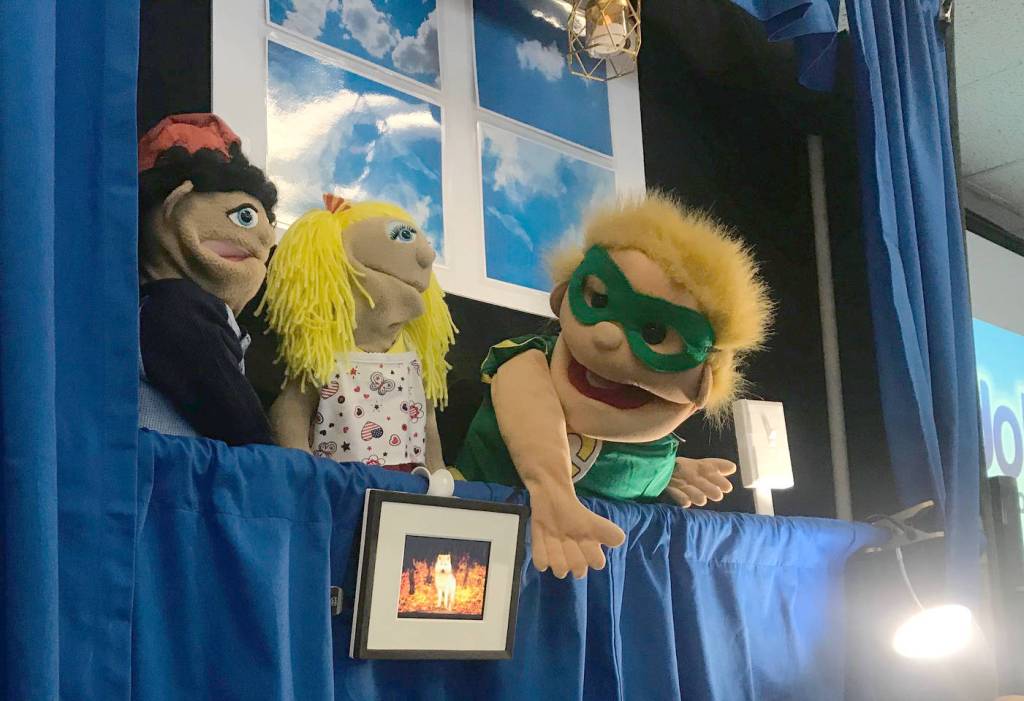 Anya Hondel performs “Capt’n Conservation: Saving Energy One Lightbulb at a Time,” a puppet show which focuses on energy conservation, at Wednesday’s joint Kenai/Soldotna Chamber of Commerce luncheon. The project, which is accompanied by a coloring book and website, took home top prize during 2017’s Caring for the Kenai Competition. The competition asks students to think outside the box to solve issues facing their community and is hoping to expand beyond the peninsula with “Caring for my Backyard,” a community partnership available anywhere there are backyards and youth with creative ideas . (Photo by Kat Sorensen/Peninsula Clarion)