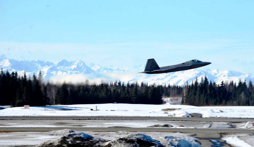 A U.S. Air Force F-22 “Raptor” fighter jet takes off from the Kenai Municipal Airport on Monday, March 19, 2018 in Kenai. Weather conditions stopped the fighters from landing at Joint Base Elmendorf-Richardson in Anchorage, their home field. Four of the F-22s belong to the 90th Fighter Squadron and four to the 525th Fighter Squadron, which were on separate training flights before landing in Kenai, said Major Stephen Montgomery, a pilot with the 90th. The fighters took off for Anchorage Monday afternoon. (Photo by Ben Boettger/Peninsula Clarion)