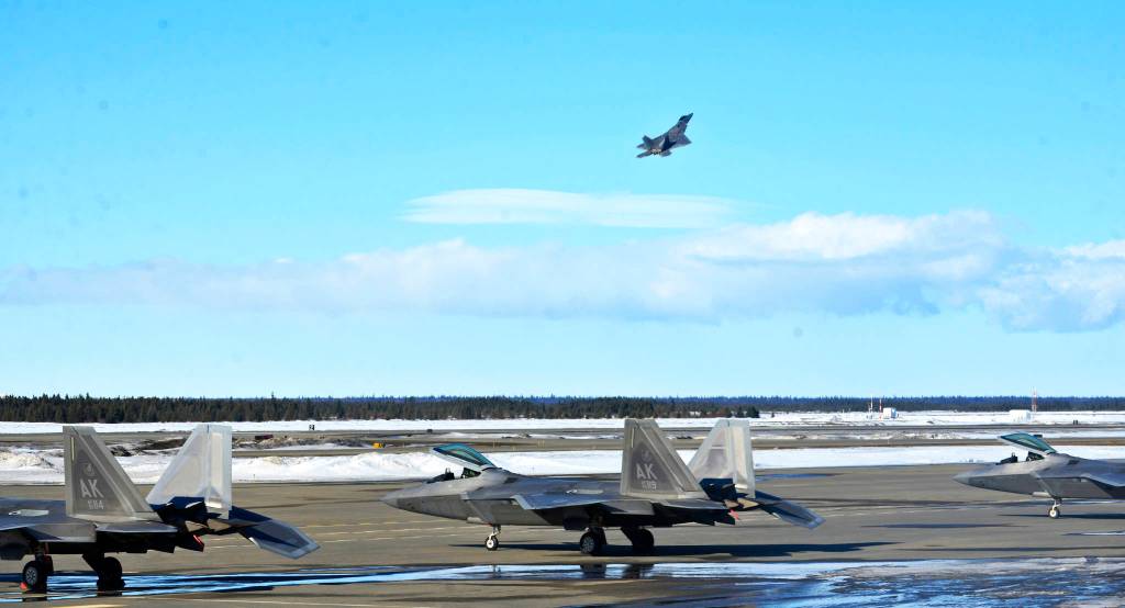 As a U.S. Air Force F-22 “Raptor” fighter jet takes off from the Kenai Municipal Airport, others await fueling on Monday, March 19, 2018 in Kenai. Eight of the fighters landed at the Kenai airport Monday after weather conditions kept them from Joint Base Elmendorf-Richardson in Anchorage, their home field. Four of the F-22s belong to the 90th Fighter Squadron and four to the 525th Fighter Squadron, which were on separate training flights before landing in Kenai, said Major Stephen Montgomery, a pilot with the 90th. The fighters took off for Anchorage Monday afternoon. F-22s from Elmendorf have been occasionally using Kenai as an alternate landing site since October 2016, when a pair of the fighters landed there to assess the possibility. (Photo by Ben Boettger/Peninsula Clarion)