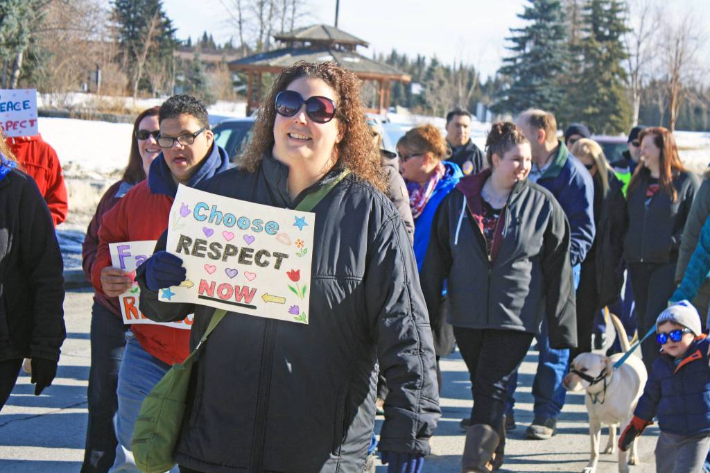 A participant in the Alaskans Choose Respect Awareness Event promotes the importance of respect during a march to the Kenai Visitor and Cultural Center in Kenai on March 28. Hosted by the LeeShore Center, the event aimed to bring awareness to the issue of domestic violence and sexual assault. (Photo by Erin Thompson/Peninsula Clarion)