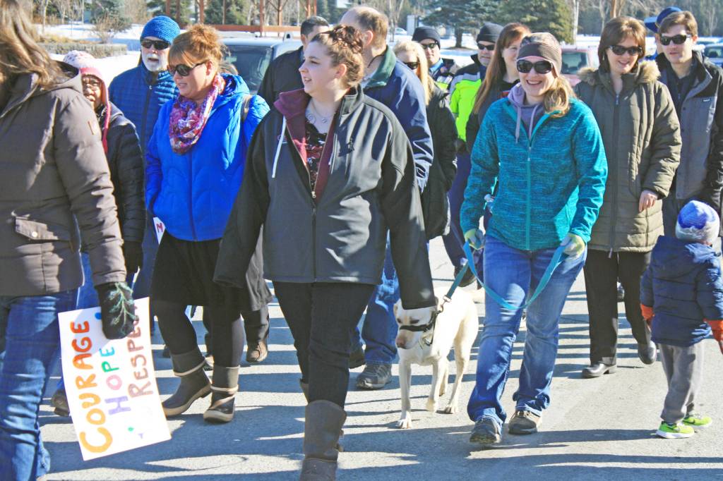 A dog leads the way during the Alaskans Choose Respect Awareness Event, hosted by the LeeShore Center, on Wednesday, March 28 in Kenai. The march aimed to draw attention to the issue of sexual assault and domestic violence. (Photo by Erin Thompson/Peninsula Clarion)