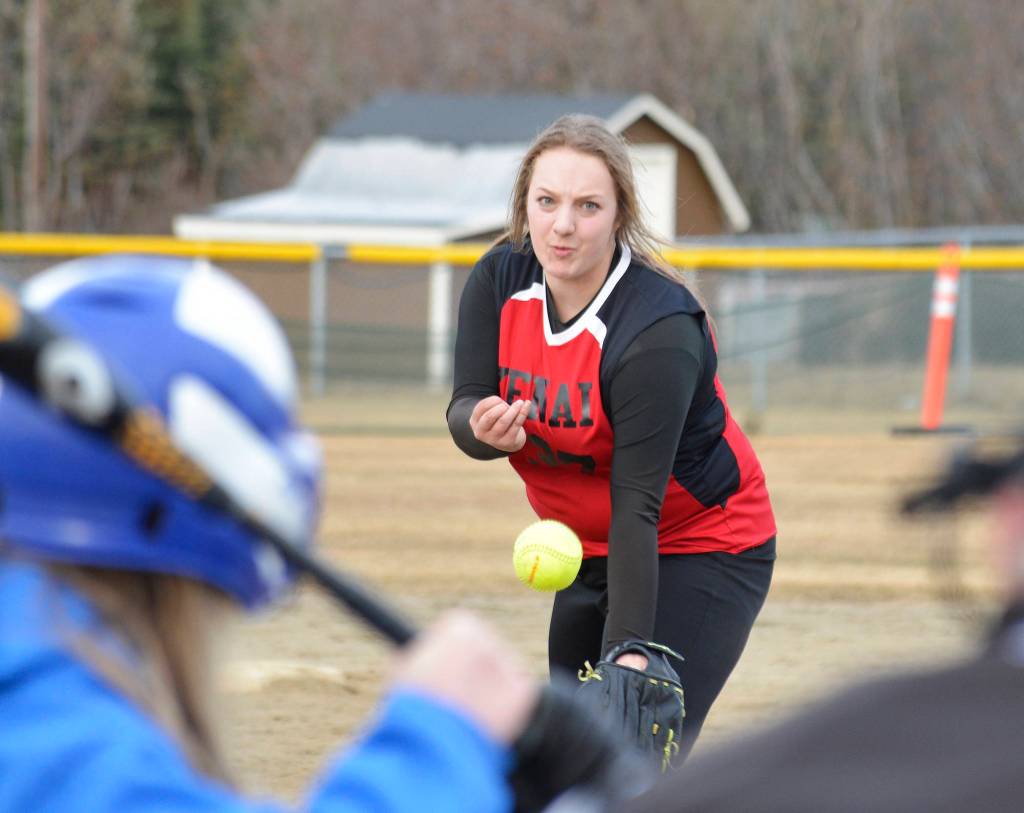 Kenai Central pitcher Savannah Jones delivers a strike to a Palmer batter April 2017 at Steve Shearer Memorial Ball Park in Kenai. (Photo by Joey Klecka/Peninsula Clarion)