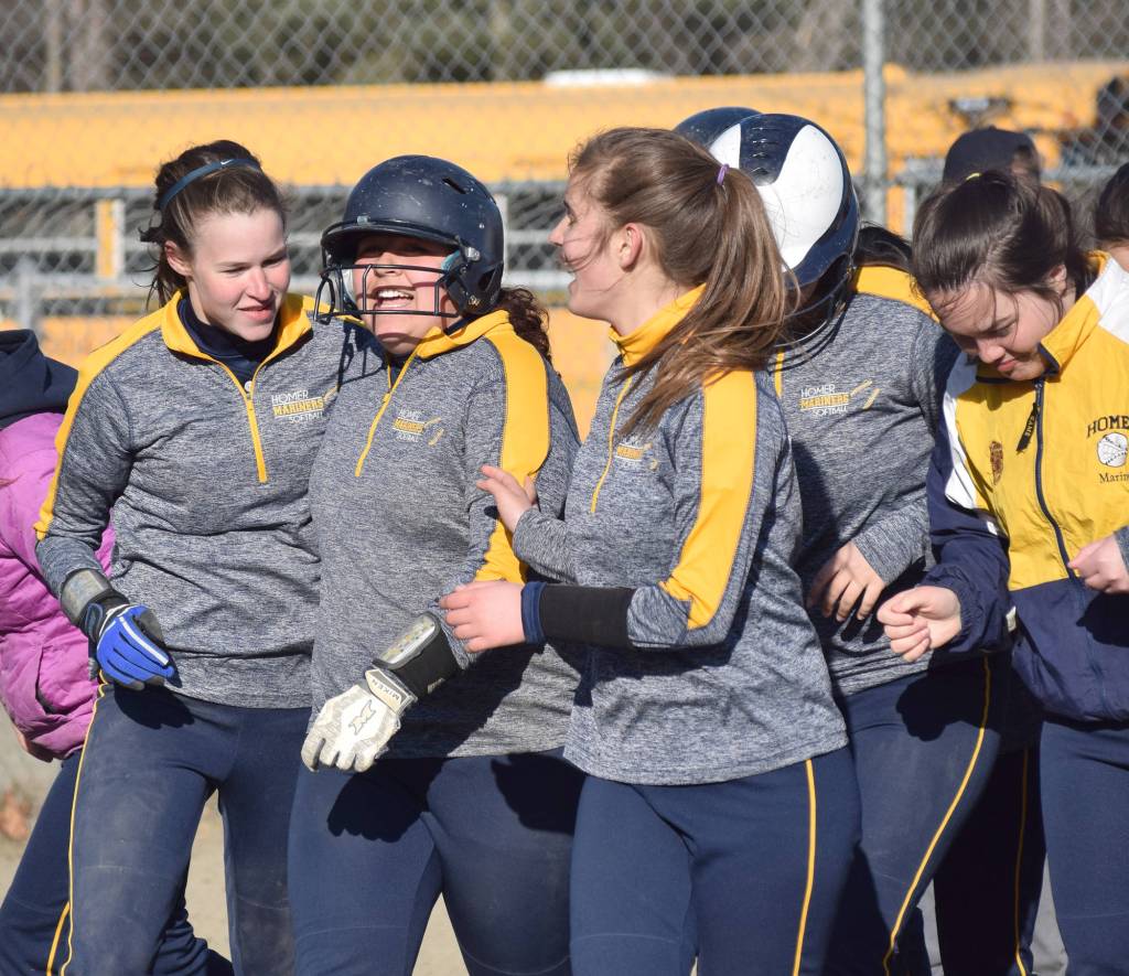 On a day when gusty winds challenged fielders to catch a pop-up, the Homer softball team blasted Soldotna with 19 base hits to record a 20-8 Northern Lights Conference win in five innings.