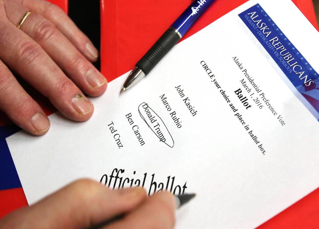 In this March 1, 2016, file photo, a Republican voter circles his choice for a Republican presidential candidate in Fairbanks, Alaska. Alaska officials say a hacker gained access to a server that hosts the state elections website on the morning of the 2016 general election but did not manipulate any information. (Eric Engman/Fairbanks Daily News-Miner via AP, file)
