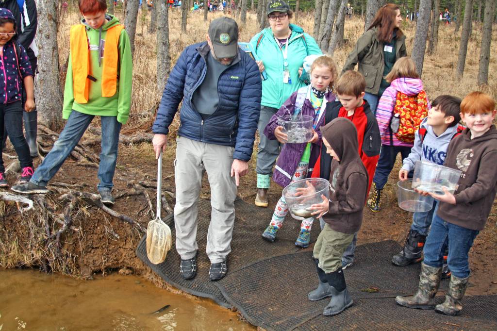Students released rainbow trout into Johnson Lake during the 18th Annual Kenai Peninsula Salmon Celebration in Kasilof. Approximately 950 borough students released 5,000 fish into the lake as part of an Alaska Department of Fish and Game restocking effort.